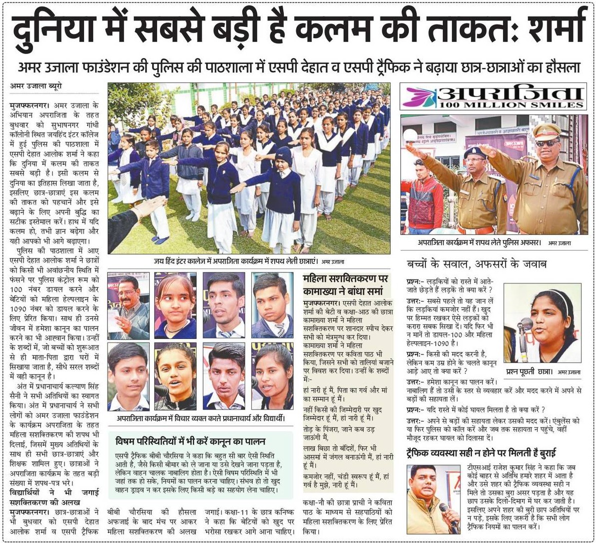 अमर उजाला फाउंडेशन के अभियान अपराजिता के तहत बुधवार, 27 फरवरी, 2019 को मुजफ्फरनगर के सुभाषनगर गांधी कॉलोनी स्थित जयहिंद इंटर कॉलेज में पुलिस की पाठशाला का आयोजन किया गयाl पाठशाला में एसपी देहात आलोक शर्मा ने बच्चों को संबोधित करते हुए कहा कि दुनिया में कलम की ताकत सबसे बड़ी है। इसी कलम से दुनिया का इतिहास लिखा जाता है, इसलिए छात्र-छात्राएं इस कलम की ताकत को पहचानें और इसे बढ़ाने के लिए अपनी बुद्धि का सटीक इस्तेमाल करें।