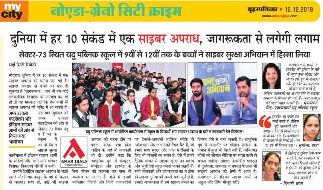 दुनिया में हर 10 सेकंड में एक साइबर अपराध की घटना घट रही है। साइबर अपराध से बचने का एक ही मूलमंत्र है ‘जागरूकता’। जब भी हम कोई इलेक्ट्रॉनिक डिवाइस का उपयोग कर रहे हों तो यह मान कर चलें कि हम कभी भी साइबर अपराध की चपेट में आ सकते हैं। अमर उजाला फाउंडेशन की ओर से बुधवार, 11 दिसम्बर, 2019 को नोएडा के सेक्टर- 73 स्थित यदु पब्लिक स्कूल में आयोजित ‘साइबर सुरक्षा कार्यशाला’ में इंडियन साइबर आर्मी के सीईओ और जाने-माने साइबर विशेषज्ञ किसलय चौधरी ने बच्चों को जागरूक किया।
