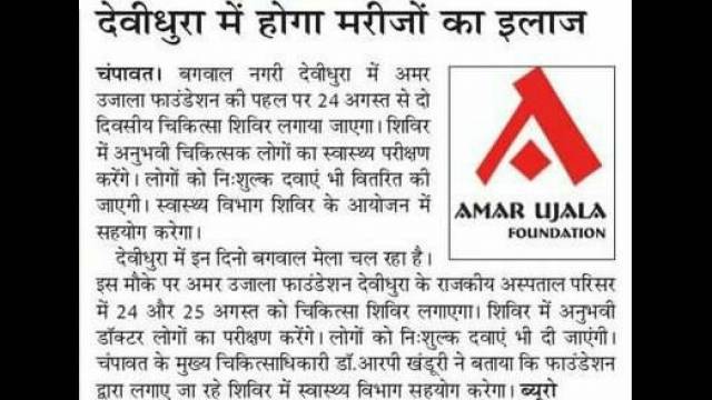 अमर उजाला फाउंडेशन 'स्वस्थ शरीर सुरक्षित जीवन' कार्यक्रम के तहत चंपावत के बगवाल नगरी देवीधुरा के राजकीय अस्पताल परिसर में 24 और 25 अगस्त को दो दिवसीय निःशुल्क स्वास्थ्य शिविर का आयोजन किया जा रहा हैl