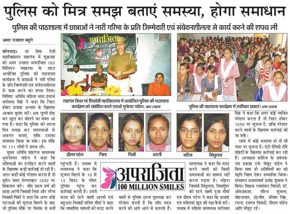 अमर उजाला फाउंडेशन के अभियान अपराजिता- 100 मिलियन स्माइल्स के तहत शुक्रवार, 15 मार्च, 2019 को सोनभद्र के शाहगंज स्थित मां शिव देवी महाविद्यालय में पुलिस की पाठशाला का आयोजन किया गयाl पाठशाला को संबोधित करते हुए महिला थाना इंचार्ज सरोजमा सिंह ने कहा कि निडर होकर छात्राएं अन्याय के खिलाफ आवाज बुलंद करें। अब चुप्पी तोड़ कर खुल कर बोलने का वक्त आ गया है। छात्राओं को प्रेरित करते हुए कहा कि पुलिस को अपना मित्र समझ कर समस्याओं से अवगत कराएं, ताकि उसका समाधान किया जा सके।