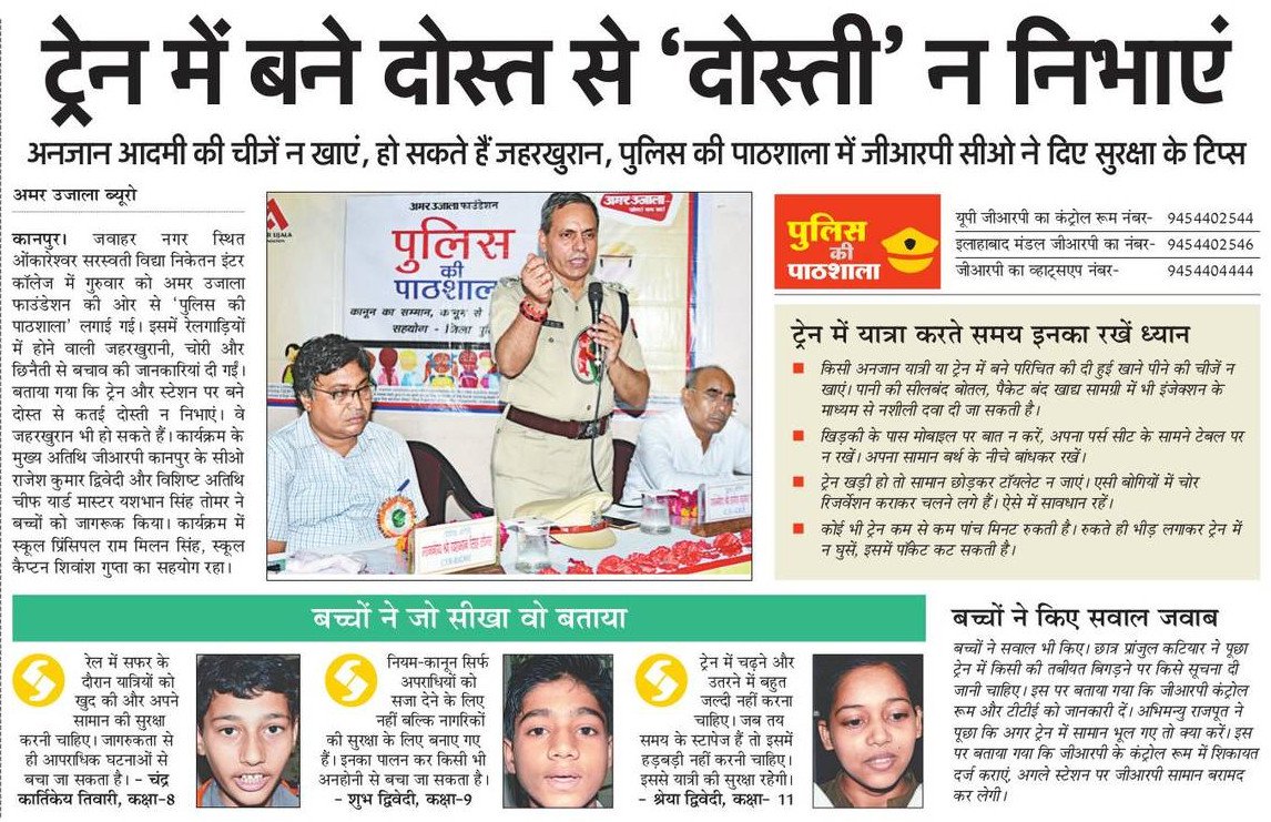 कानपुर के जवाहर नगर स्थित ओंकारेश्वर सरस्वती विद्या निकेतन इंटर कॉलेज में 26 जुलाई को अमर उजाला फाउंडेशन द्वारा पुलिस की पाठशाला का आयोजन किया गयाl कानपुर जीआरपी के सीओ राजेश कुमार द्विवेदी ने बच्चों को ट्रेन में सफ़र के दौरान होने वाली जहरखुरानी, चोरी और छिनैती से बचाव की जानकारी प्रदान कीl
