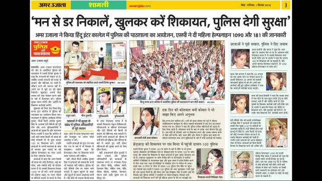 अमर उजाला फाउंडेशन की ओर से 31 अगस्त, 2018 (शुक्रवार) को शामली के मिल रोड स्थित हिंदू कन्या इंटर कॉलेज में पुलिस की पाठशाला का आयोजन किया गयाl पाठशाला में पुलिस अधीक्षक दिनेश कुमार ने कहा कि मनचलों की ताकत है डर, क्योंकि उनकी हरकतों की वजह से महिलाएं डर जाती हैंl अपने मन में घुसे डर को बाहर निकालेंl खुलकर अपनी पीड़ा व्यक्त करें तथा परेशान करने वाले के बारे में शिकायत करेंl पुलिस सुरक्षा प्रदान करेगी और आरोपी के खिलाफ एक्शन लेगीl